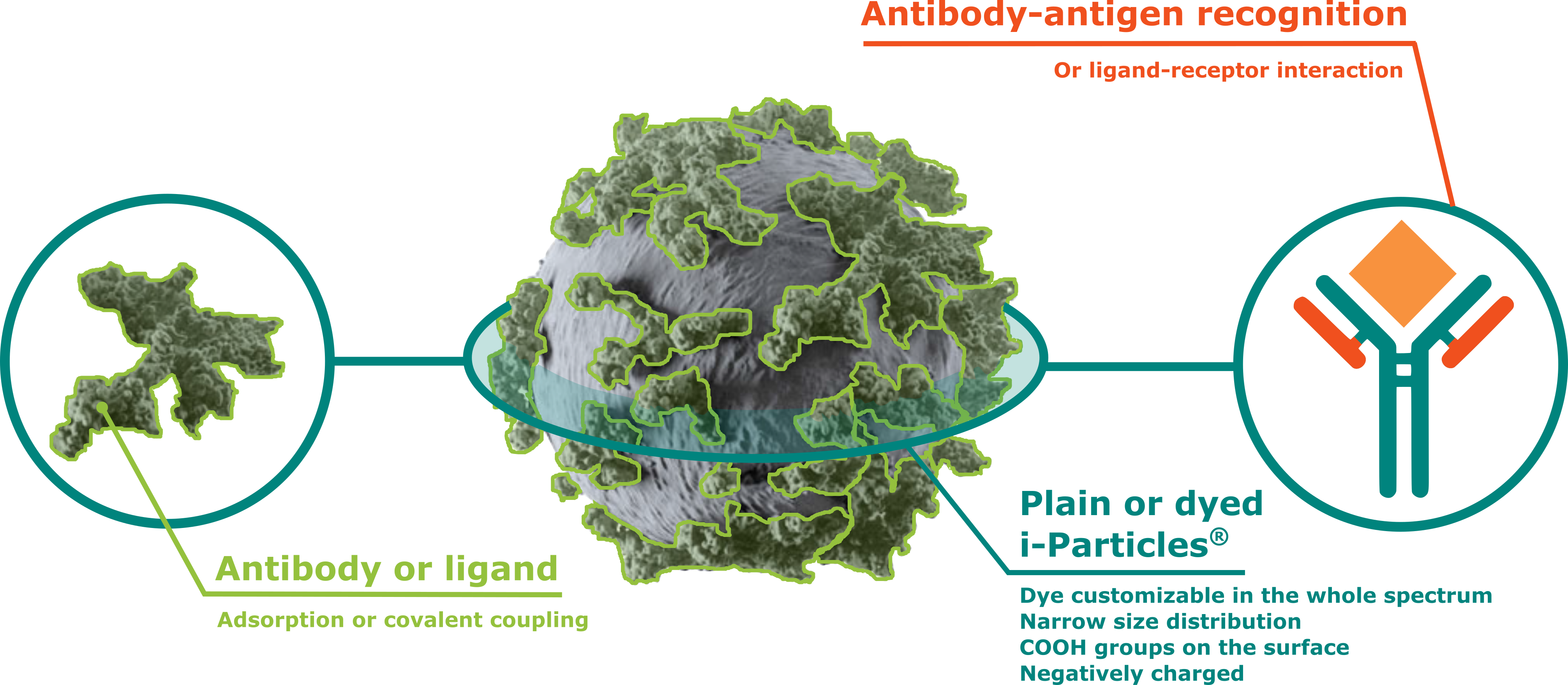 Formulating your antibody or ligand with i-Particles® is the key to reveal antigen or receptor interactions with a biodegradable platform for lateral flow tests, agglutination tests or bead-ELISA.